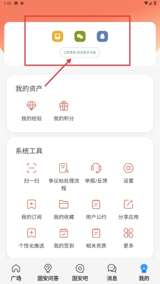3、切换到我的界面,点击立即登录/绑定更多功能,完成登录绑定,解锁经验、积分等资产管理权限。