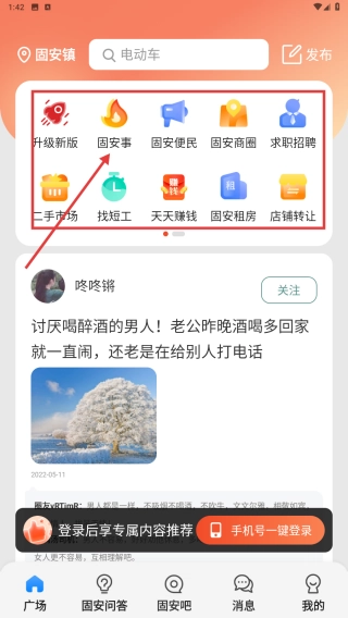 1. 打开广场页面,轻点固安事图标,进入相应板块,获取固安本地的资讯以及生活服务类信息。