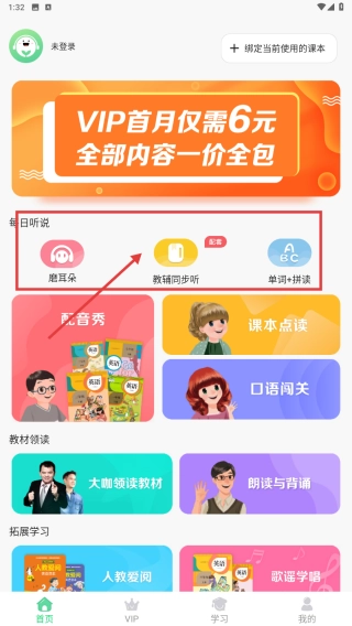 1、打开应用首页,点击教材同步听功能,进入对应页面,可同步教材内容进行听力学习。