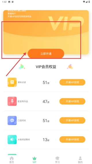 2、切换到VIP界面,点击立即开通按钮,选择套餐完成支付,解锁VIP专属学习内容。