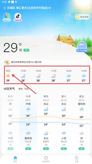 1、在天气首页,查看现在时段的温度、天气状况,了解当前东城区的实时天气信息的情况。