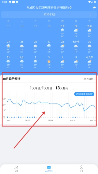 2、切换到40日趋势预报页面,分析温度变化曲线,掌握未来天气升降温及降雨趋势。