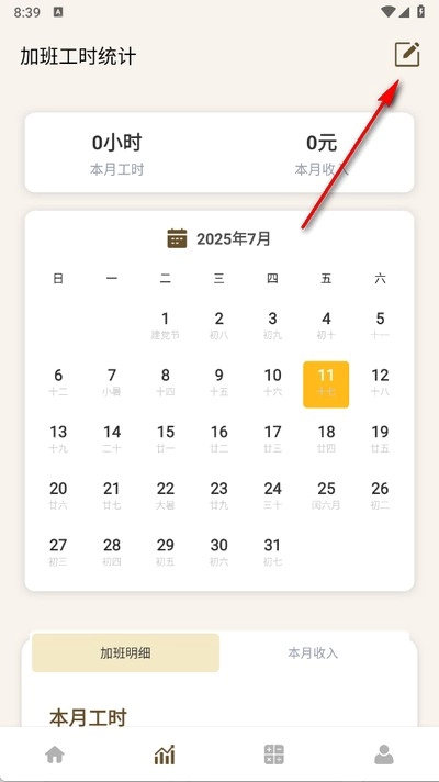 打开软件进入主页,点击下方加班统计;
