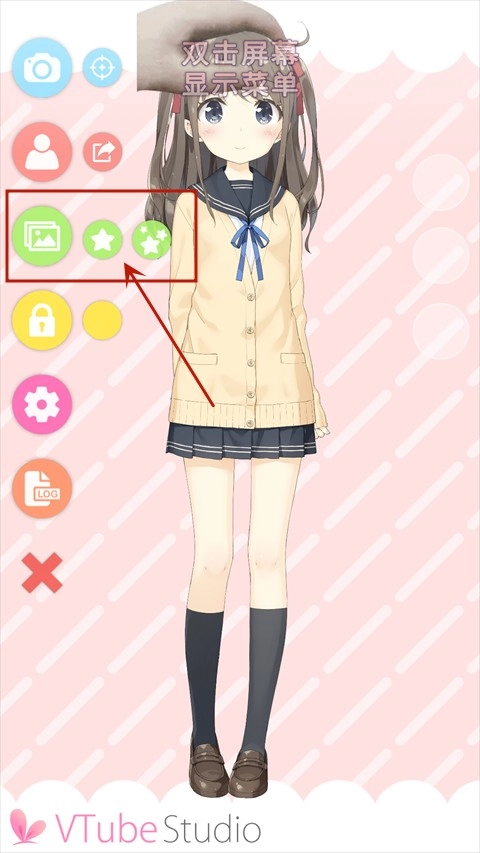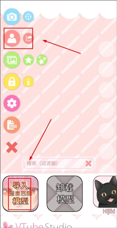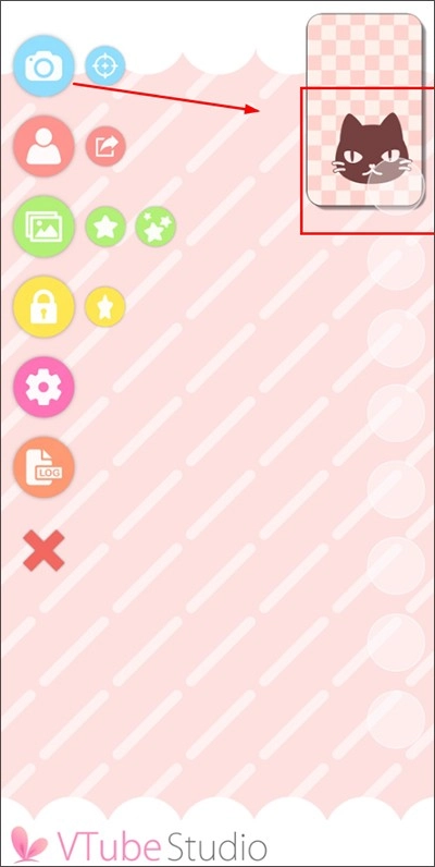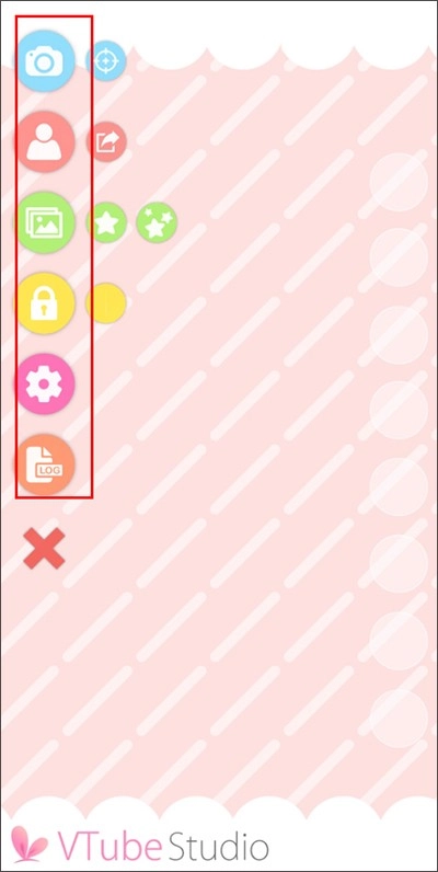 打开VTube Studio后,软件的主要功能集中在左侧区域,从上至下依次排列为:拍照、导入模型、背景、位置锁定、设置、记录和图标隐藏。