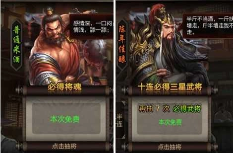 在游戏前期,除了主线收复任务奖励的基础武将外,获取武将最直接的途径就是酒馆。通过任务得到的米酒,每5瓶可进行一次武将抽取,虽有机会获得武将,但通常得到的都是将魂。而十连抽则必定能获得三星武将。VIP玩家每天前三次十连抽享受半价优惠,在游戏前期每天抽三次,能抽到武将是很划算的。