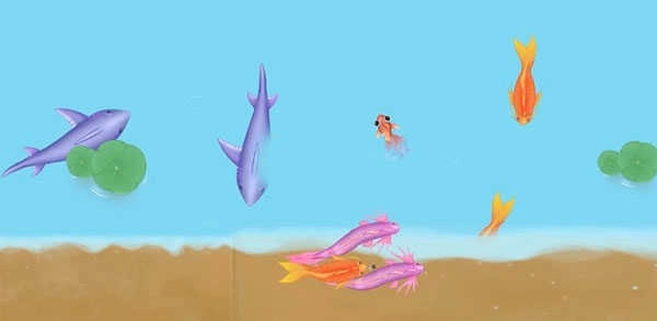 要战胜对大鱼的畏惧,大胆迎上去,别贴着边游,往中间去能吃到更多东西。碰到大鱼就马上做个漂亮的转身假动作,让那些笨大鱼乖乖游走。