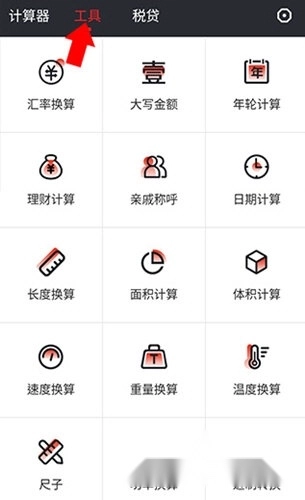 点击页面顶部导航栏里的“工具”选项,就能切换到工具菜单,这里为用户提供了多种实用功能,包括房贷计算、汇率换算、阿拉伯数字转中文大写、年轮计算、理财计算、亲戚称呼计算、长度换算、面积计算以及体积计算等。