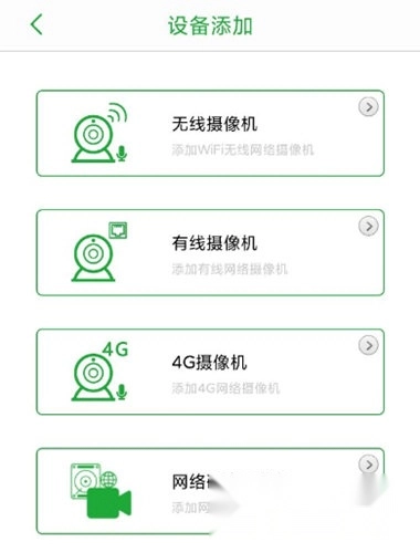 选择需要添加的设备类型:无线摄像机、有限摄像机、4G摄像机、网络硬盘录像机,这里以无线摄像机为例。