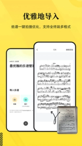 乐其爱乐谱纸谱一键轻松拍,具备自动框选、方向调整与变形校正功能,轻松解决乐谱画质问题,一键完成去噪、去阴影、色彩及亮度优化;支持乐谱全格式(jpg、png、pdf等)、全终端(手机相册、手机文件、平板文件、电脑文件等)一键导入。