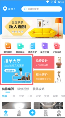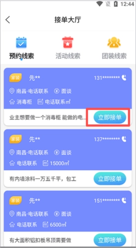 接单大厅:装修服务商拓展客源的平台,家装、工装各类业务一应俱全。