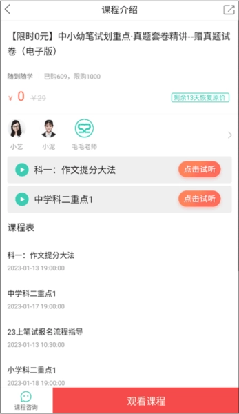 在课程介绍页面里找到“免费报名”或者“立即购买”的选项并点击,等弹出选择框后,点击“好的”来确认。