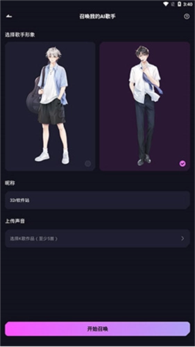 要使用【召唤AI歌手】功能,需先挑选歌手形象,接着输入昵称,最后上传你的K歌作品。