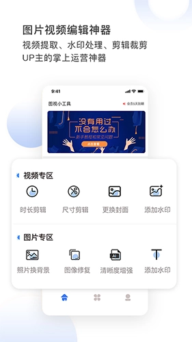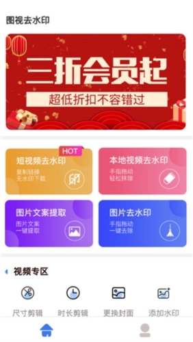 图视去水印是重庆见变科技有限公司推出的视频制作软件,用户可在此打造心仪视频,还能一键添加水印防止视频被盗用。该软件支持文字与图片水印添加,水印的大小和位置可自主设置,通过双指拖动选择框就能调节水印;同时为用户提供多种尺寸型号,可任意选择进行裁剪,也支持自由裁剪,只需拖动选择框即可确定照片大小。