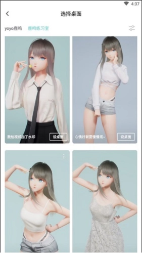 打开《人工桌面》,鹿鸣从屏幕下方探出脑袋,一脸天真地望着你,这时点击“唤醒”就能让她常驻你的手机桌面。你可以挑选不同的服装、风格与配色,自由搭配出专属的屏幕效果。点击界面右下角的“选桌面”按钮,就能进入“鹿鸣练习室”板块,这里有鹿鸣的舞蹈作品和日常片段可供设置为动态壁纸,并且内容会持续更新,每次都能让你发现她不一样的一面。