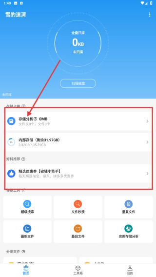 1、进入首页,查看存储分析数据,了解手机存储占用情况,清理无用文件释放空间,点击查看。