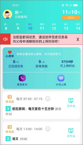 2. 完成绑定之后,孩子便能够查看父母所设置的每日任务,在完成这些任务之后就能够领取上网时长。