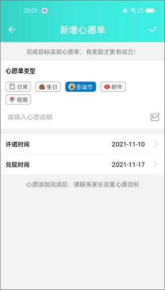 4. 点击新增心愿单选项,孩子可以对心愿单的类型、许诺时间以及兑换时间进行设置,给予孩子奖励能够激发他们的动力。