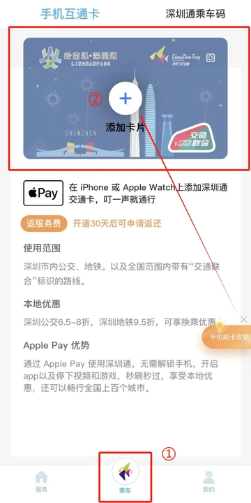重要提示:Apple Pay深圳互联互通卡开卡时需要支付20元的可退服务费。此服务费可以在开卡30天后通过深圳通App申请退款。