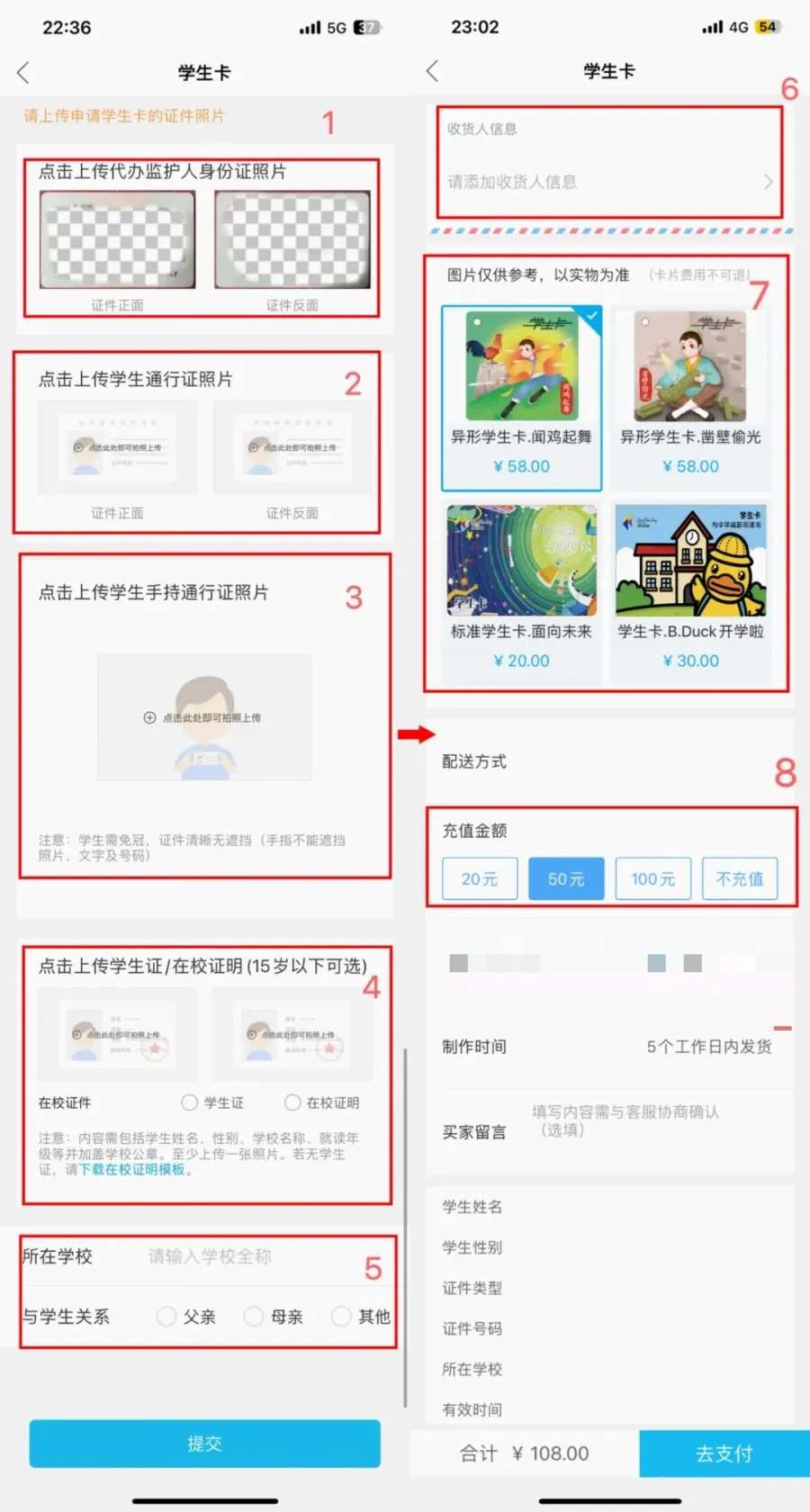 根据提示上传代办人证件、学生证件原件及学生本人手持证件照片,点击【提交】。填写收件地址,选择卡片类型以及充值金额,点击【支付】。