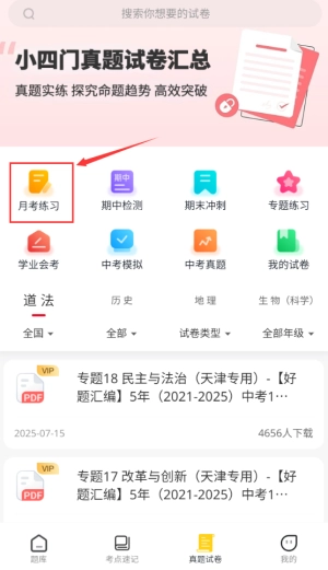 1智能题库系统涵盖月考、期中、期末等阶段性检测试卷,还包括历年中考真题模拟。其题目来源权威且可靠,全面覆盖各年级的重点、难点与考点。