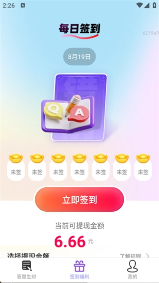 2. 用户每天登录签到,即可领取现金红包、答题机会、额外奖励等福利,连续签到还能获得更多奖励;