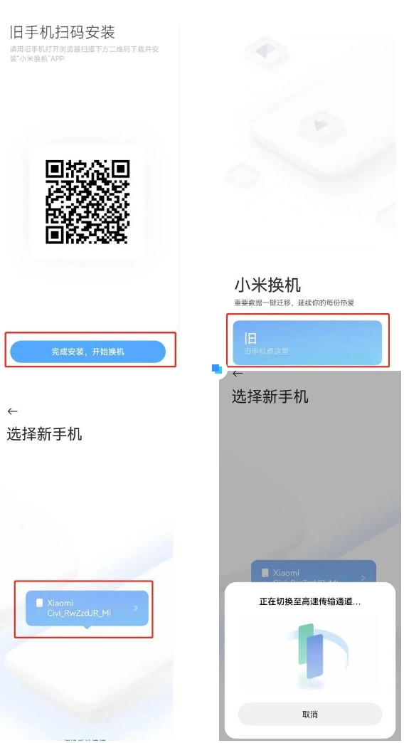 在新手机上,选择【完成安装,开始换机】选项。与此同时,在旧手机上安装好【小米换机】应用并将其开启,点击【旧】这个按钮,随后在出现的选项中选择新手机的型号,以此来建立连接。