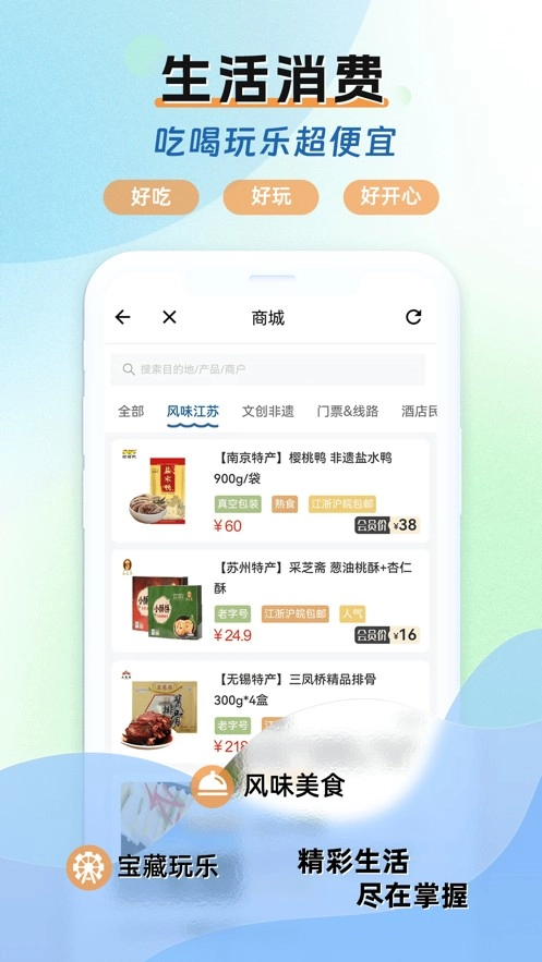 可以使用这款软件来办理数字旅游卡,操作简单,轻松好上手,还可以在线预约酒店民宿,景点门票等等,还可以在商场之中购买具有江苏当地特色的美食,文创等物品,便捷好用。