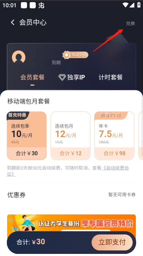 2、点击右上角兑换。