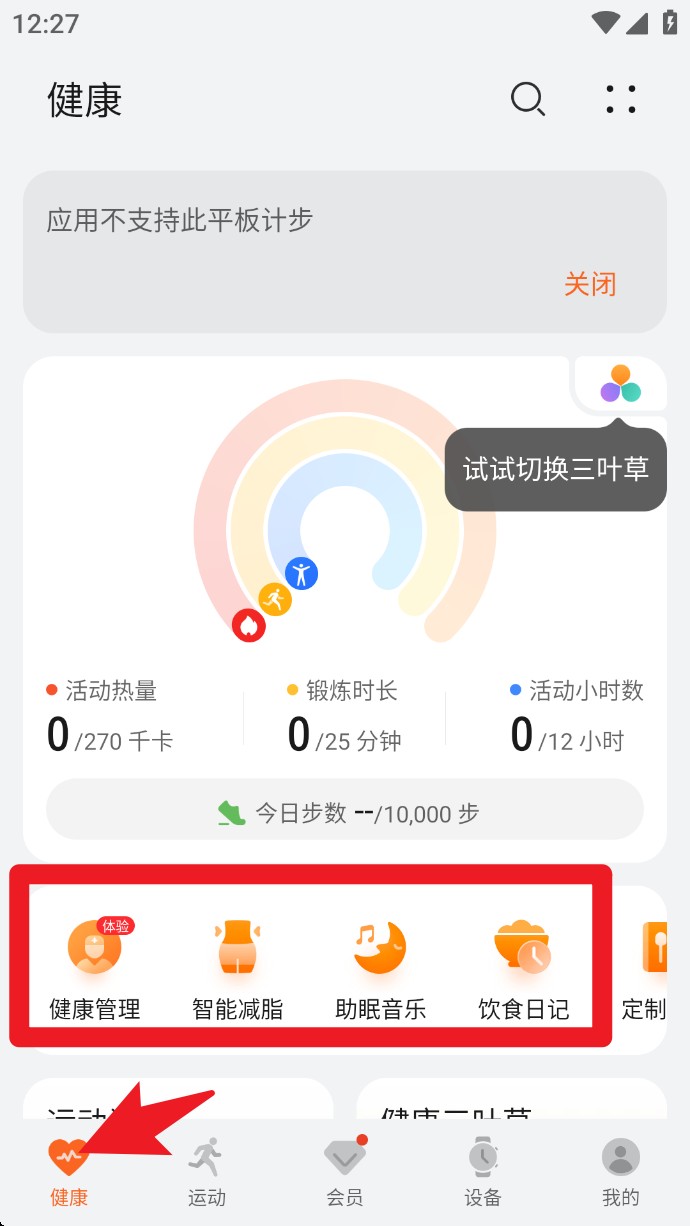 1. 在App首页底部点击“健康”选项,就可以查看活动消耗的热量、锻炼时间以及步数等日常数据,并且能够快速进入健康管理等相关功能。