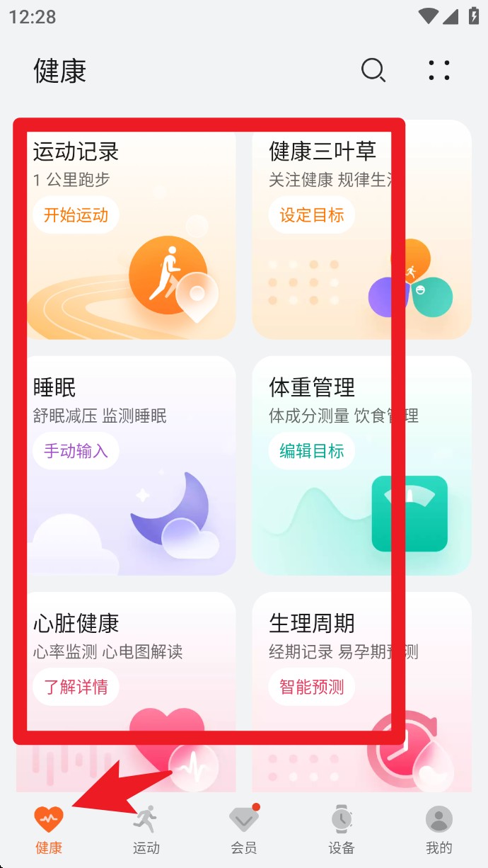 2. 在健康页面继续下滑,可手动进入睡眠、体重、生理周期等专项板块,添加每日记录、设置目标并查看历史数据。