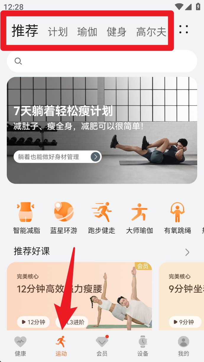 3. 点击下方“运动”栏目进入训练区,可浏览推荐好课,选择跑步健走、瑜伽课程或高强度燃脂计划,按需开始锻炼。