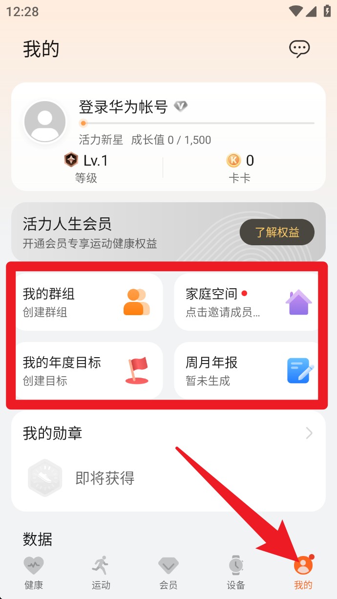 5. 进入“我的”个人中心页面,可查看年度目标、家庭空间和年度报告,支持创建群组与查看活力成长进度等数据。