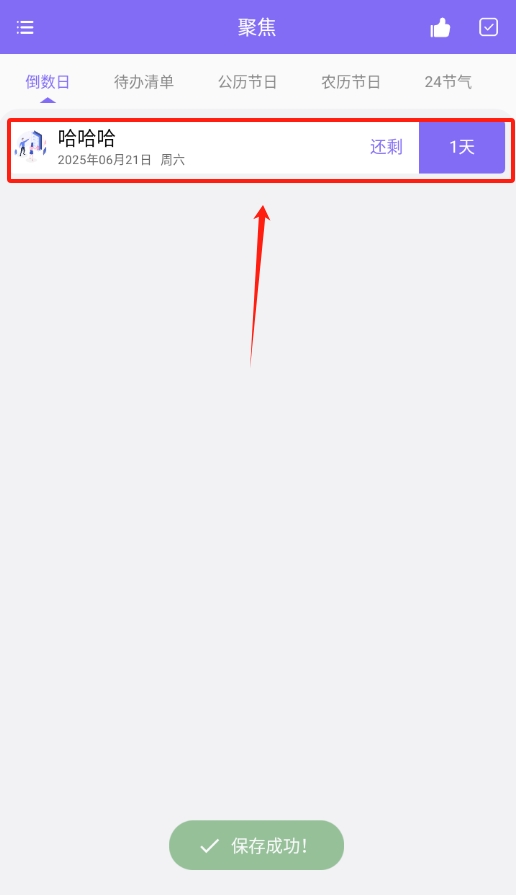 3、保存成功返回首页,就能看到刚刚添加的倒数日事项,随时查看距离日子还有多久。