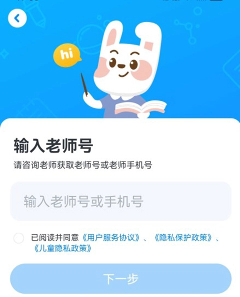 2、然后需要输入老师号,或者老师号的手机号,点击下一步,然后绑定号手机号码就可以成功进入软件,开始做作业啦!