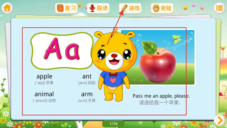 2、在字母学习页认读发音,再点击演练,进入书写练习界面。