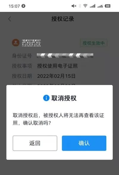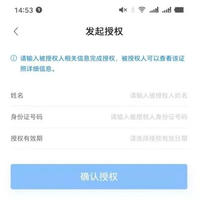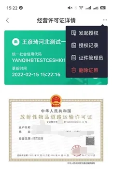 点击右上角菜单,点击【发起授权】,输入对应用户姓名、身份证、授权日期给其他用户进行证照授权。