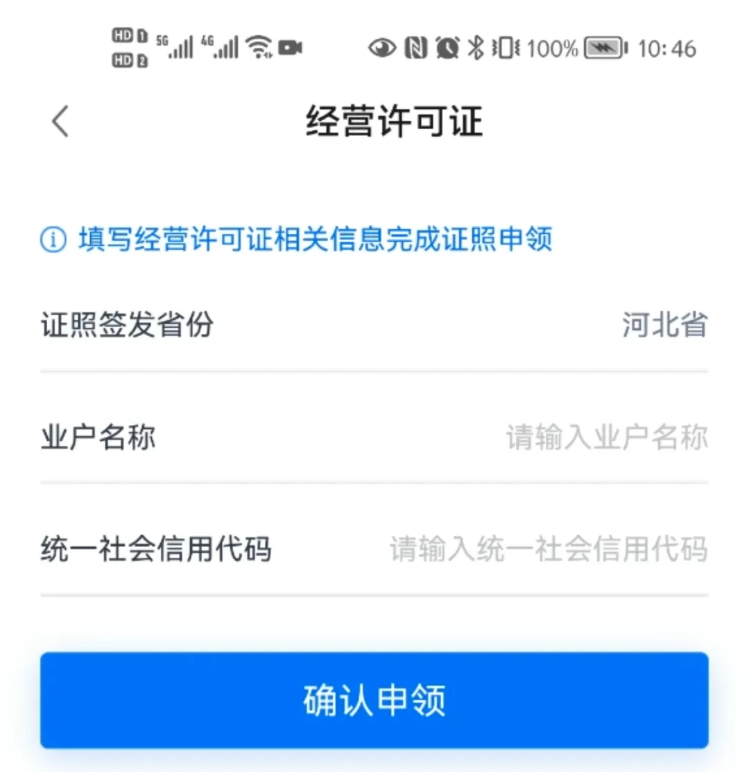 在输入与经营许可证对应的统一社会信用代码、业户名称以及证照类型之后,点击“领取”按钮,即可完成证照申领操作,并随即进入证照列表。