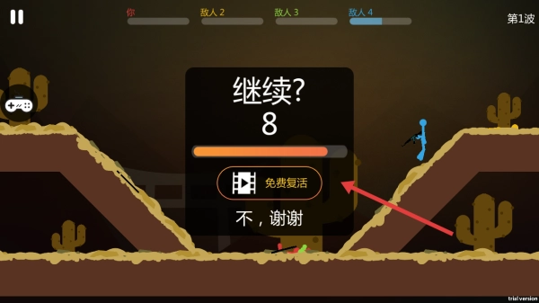 3、如果战斗失败,会弹出继续的提示框,可以选择免费复活继续战斗,也可以选择不谢谢结束本局。