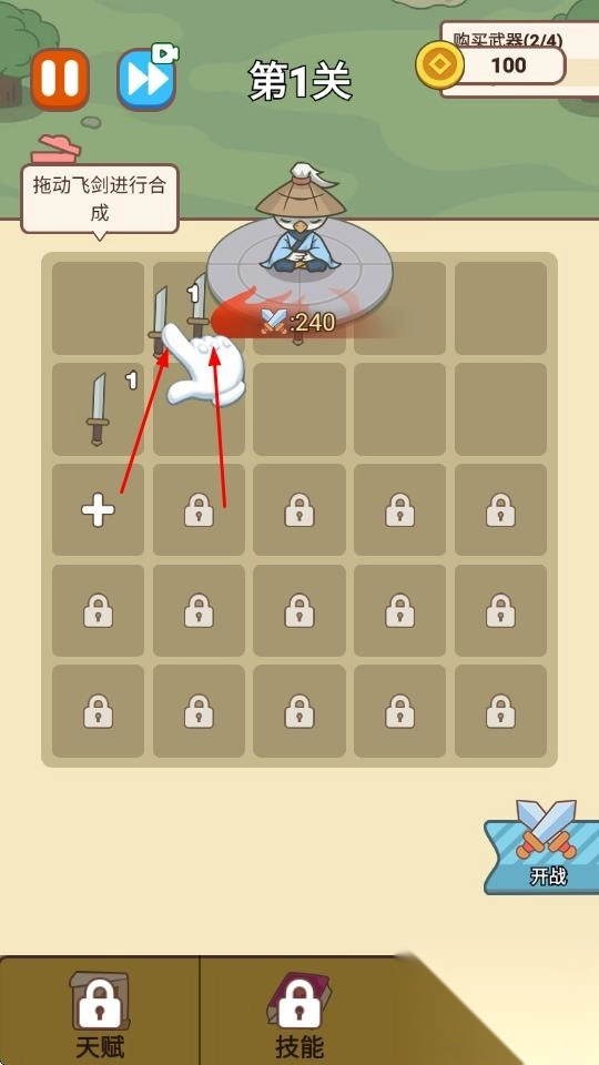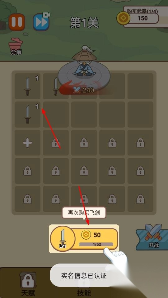 3、点击“开战”按钮,即可进入第1关。在此关卡中,武器会自动攻击怪物,你只需指挥推进关卡进程,就能获取相应奖励。