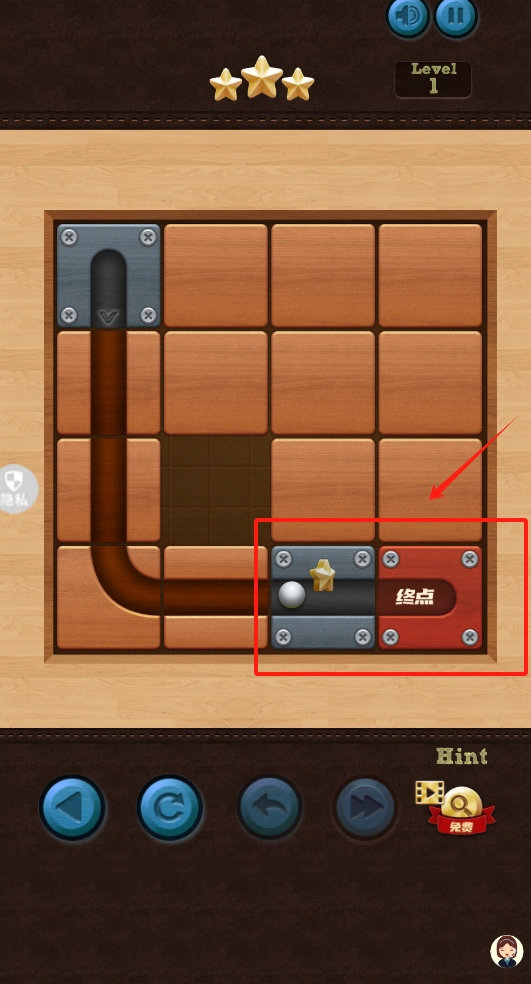 3、通过操控木质方块来拼接路径,从而引导球球抵达终点,右下角设有按钮可辅助通关。