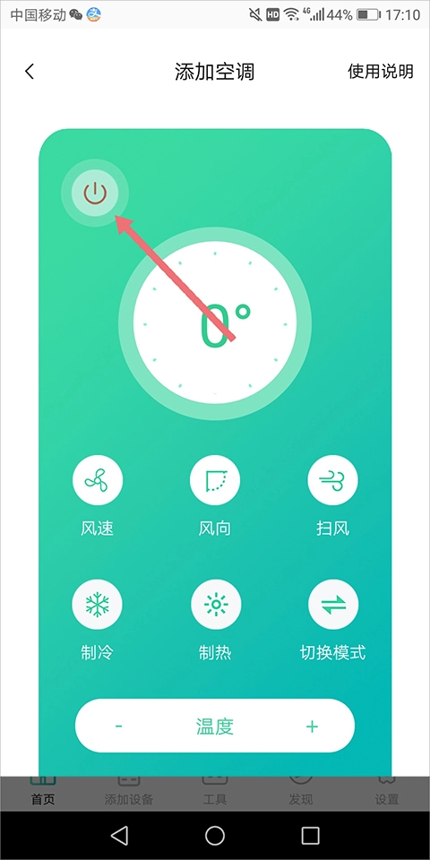 5、选择好后软件直接进入该设备的遥控页面中,用户点击该页面左上角的电源键(下图红色箭头所指)