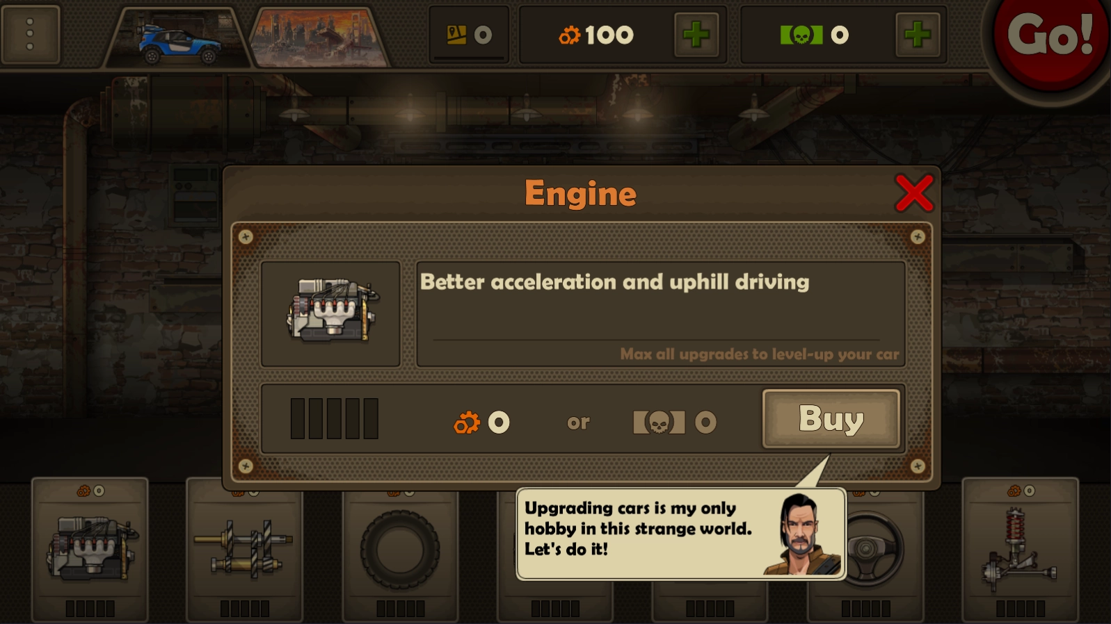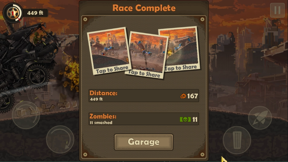 6、就算玩家们失败了也不要紧,游戏过程才是关键。只要游戏结束,就能获得金币。金币可用于汽车升级,像提升汽车的加速、防御能力等。而且还能给汽车配置武器,这样就能在远处消灭僵尸。这些装备对于玩家顺利过关而言,无疑是重中之重。
