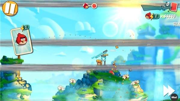 第5关:到了第5关可就没有引导了,需要从红、蓝、黄鸟中选一个,小编推荐利用小红的技能吹动第一个建筑向前滚动(用蓝、黄鸟需要打下方的轮子),然后顺利砸坏右方的建筑,也终于见到了小鸟2代的亮点之一“大型BOSS猪!”,看到下方长长的血条你怕不怕?不用担心,交给身怀绝技的小鸟和聪明的你绝对没问题哦。首先,利用小红将第一个建筑向前吹,砸爆大胖猪。然后用黄鸟瞄准下图中的三角形冰块,只要冰块一碎,大量的滚石就会倾盆而下!就算BOSS猪血再多肉再厚也会把它砸个稀巴烂!