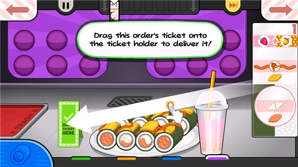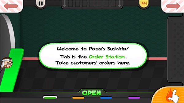 4、紧接着会向玩家介绍寿司店,点击右下角的按钮,即可进入订单站,顾客的订单全都在这个地方。