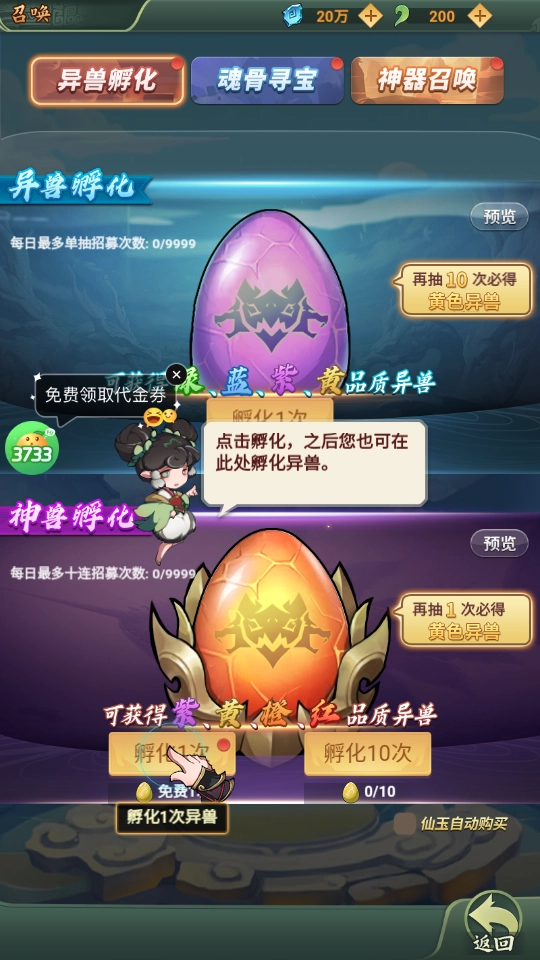 4、在此处点击“孵化”,就能孵化异兽,通常可得到绿、蓝、紫、黄、橙、红等不同品质的异兽。