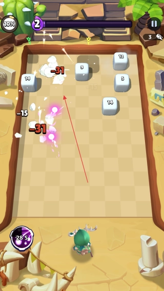 3、随着关卡推进,躲避砖块反弹物,持续攻击砖块,完成关卡目标进度,如达到10%,进入下一关卡。