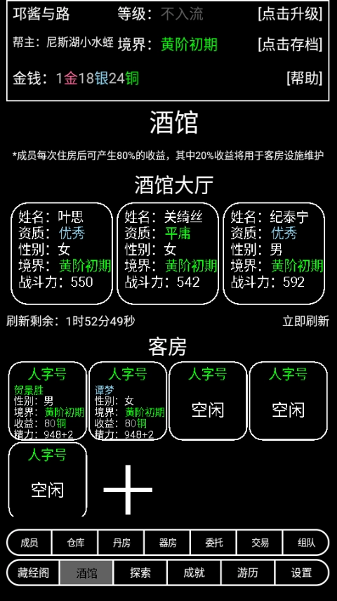 5、酒馆房间的管理极为关键,切不可让本能够正常入住的人只能打地铺。这种情况不仅会造成资源的浪费,还会对人们恢复精力的速度产生不良影响,从而降低后续探索的效率。房间的升级以及丹药、炼器方面也是同样的道理,务必保证每个房间都留有足够的空位。