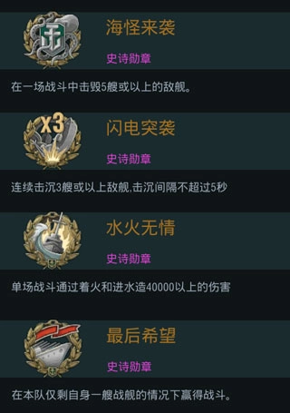 难度最大的应该是史诗勋章了,每一个勋章的达成条件都比较难实现,特别是【闪电突袭】,要连续击毁3艘敌舰,间隔还不能超过5秒……