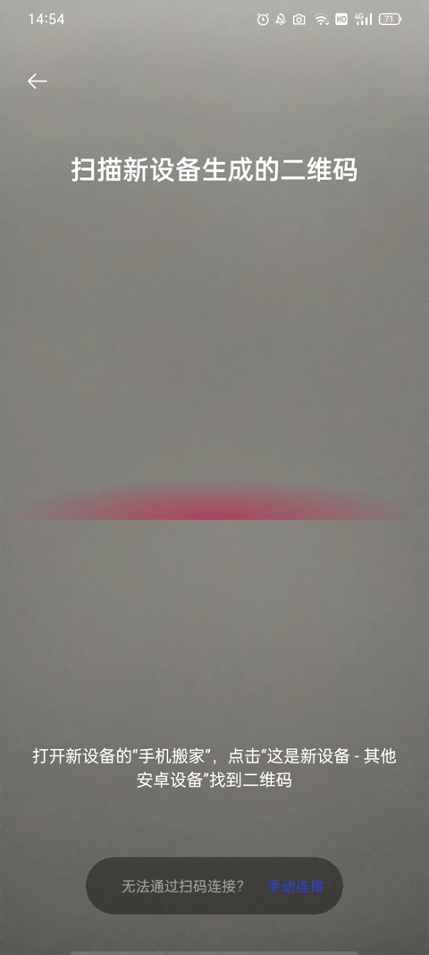 5、最后弹出了一个扫描框,你需要将新设备上的一加搬家打开,点击“这是新设备,其他安卓设备”中找到二维码,将扫描框对准设备生成的二维码即可将数据转移。