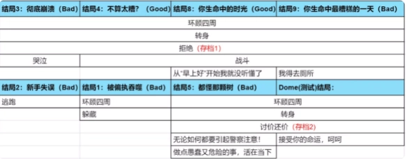 当前本作处于Dome测试版本,结局6与结局7暂未推出。另外,鉴于目前为Dome测试版本,图中的测试结局并不完整。待后续游戏开发者对游戏进行完善后,测试结局将会进一步延展。
